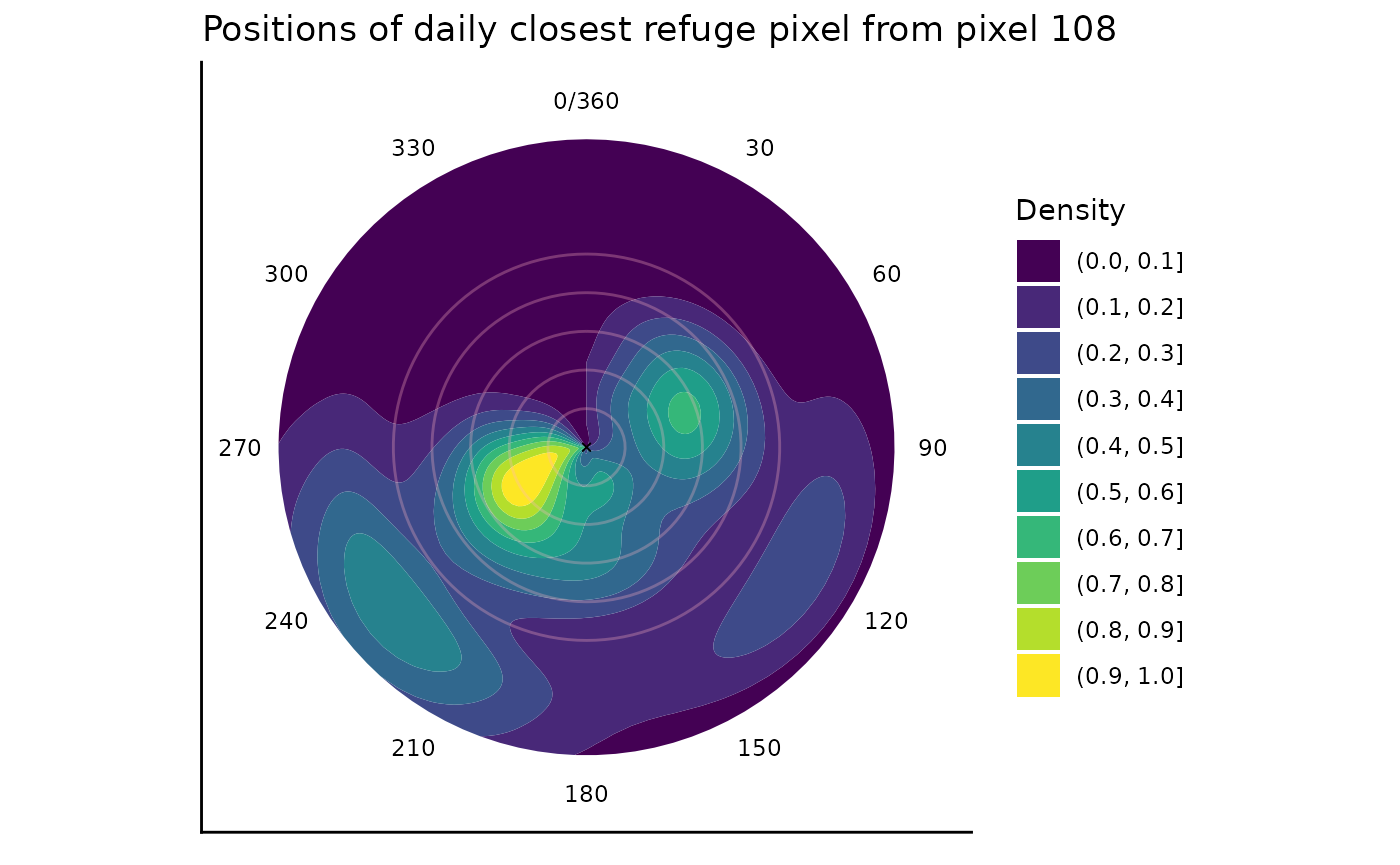 ggplot2::labs(title = "Positions of daily closest refuge pixel from pixel 108", fill = "Density")## Warning in FUN(X[[i]], ...): NAs introduced by coercion
