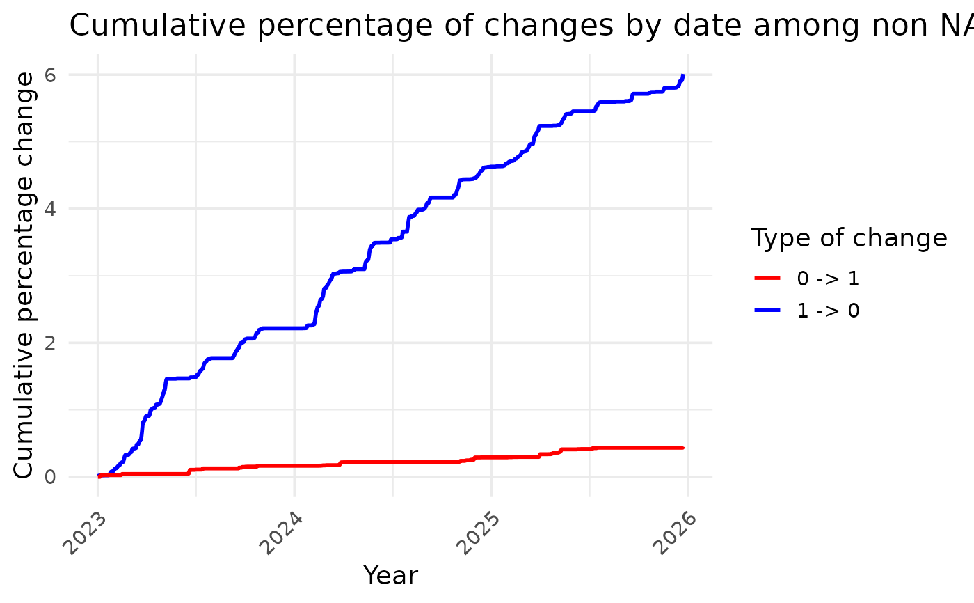 In R consol it returns a message with the number of 1 corrected to 0 and the number of 0 corrected to 1. If plot=TURE it shows the cumulative percentage of changes through time. The object return if a dataframe with one line percombinaison of date and pixel_id. The dataframe has the same structure than the ones in true_event_df_list.